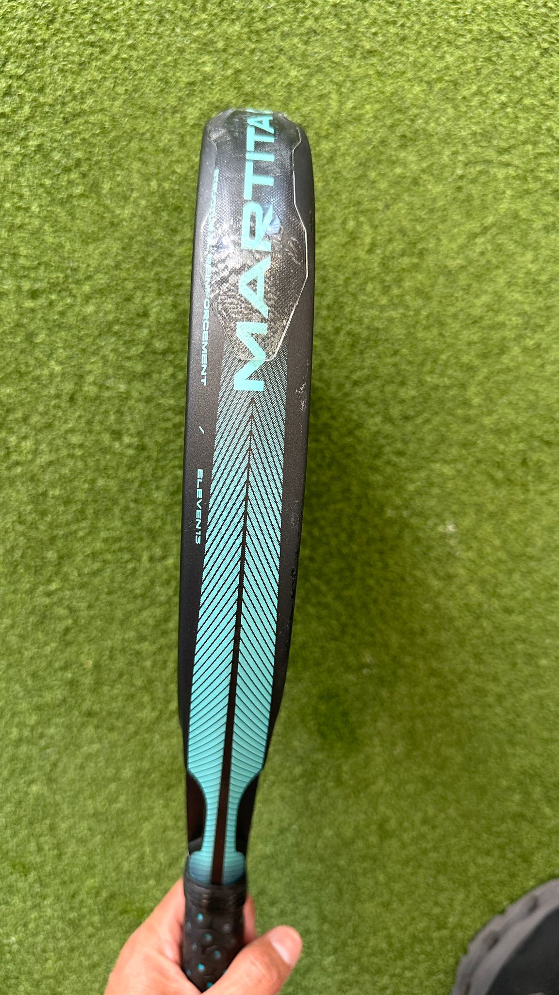The CROSS IT LIGHT is Marta Ortega's racket. It is a racket made for professional players that incorporates the latest innovation to be taken to the padel court. In addition, it has the ease of handling offered by the lightness of the Light racquets. It is made of Carbon Aluminized 24K fiber on the surface and EVA Soft Energy rubber on the inside. This combination of materials guarantees high levels of power and the best control. Marta Ortega's racket from the new CROSS IT range combines the best innovation, lightness, and performance. The Extra Power Grip, a longer grip, moves the balance to the top of the head to improve powerful shots. Aerodynamics comes to padel through Dynamic Air Flow technology. With it, the racket reduces its resistance to the air and is more efficient on impact. For its part, the ELEVEN 13 improves durability and power thanks to a pioneering arrangement of the holes. The CROSS IT LIGHT makes the difference.
