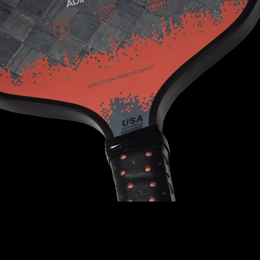 The Adipower CTRL combines the best features a pickleball racket can have. Designed for control, it also has many aspects to excel in attacking play. The racket has the perfect balance between handling and high performance. It is made of 24k Aluminized Carbon fiber, a material of great rigidity to play the most powerful shots when the moment requires it. One of its differential aspects is the Spin Blade Max technology, a rough layer incorporated in the surface that guarantees the best effects and rotation on the ball. Everything is encompassed in a racket with a spectacular design. The base color is a tinted red with different shades of grey, while white draws the three famous adidas stripes.