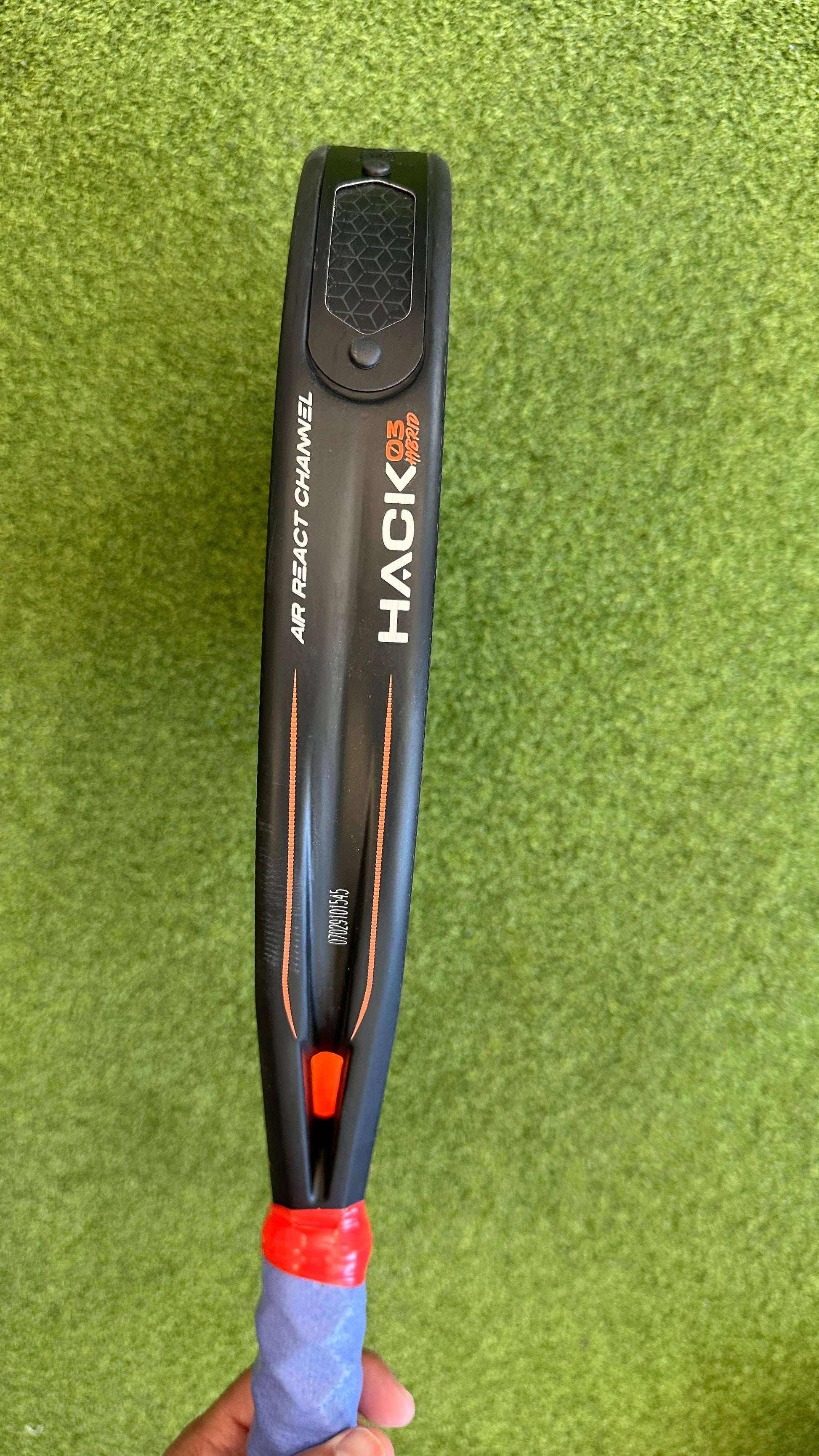 It incorporates the innovative Air React Channel system, which consists of an aerodynamic frame that simultaneously creates a firmer, more agile, and lighter structure. Its outer core is made from the new Tricarbon combined carbon, its inner core from the new MultiEva rubber, and its frame from 100% carbon fibre CarbonTube. The rough 3D Grain surface gives the racket more impact. It has the new MetalShield frame that is tailored to the latest CustomWeight plate system, allowing for balance of the racket to be modified according to the needs of every player. It has a Vibradrive systems for absorption of vibrations, a Hack core, and Nerve channels down the side of the frame. It also offers the innovative Hesacore grip that reduces effort, vibrations, and the probability of injury. The Hack Hybrid incorporates the new Adaptia system, developed for the Pro range rackets
