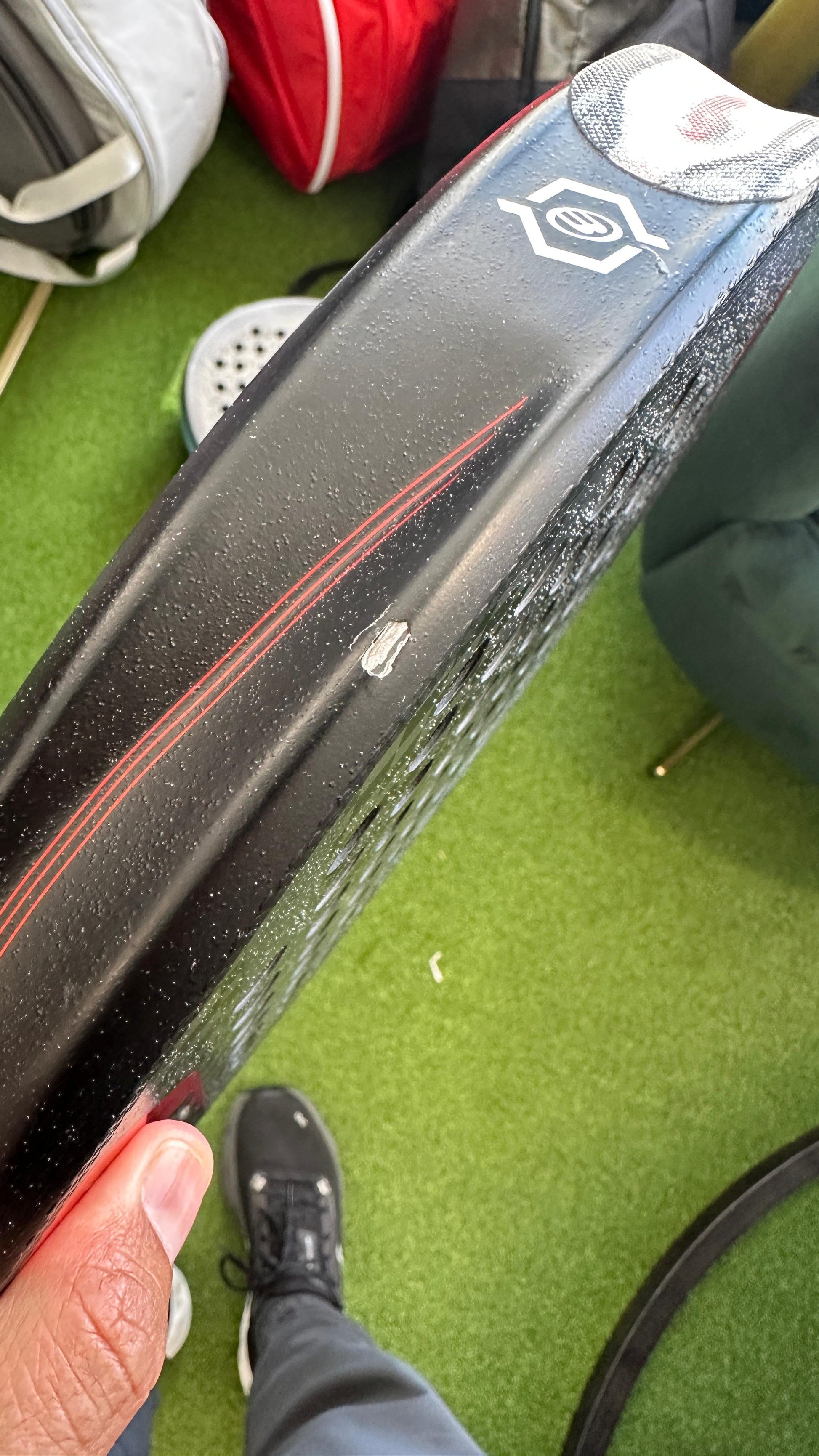 It is a channel that we create using a hollow area in the lower side of the blade. This hollow area works better than if it were a solid piece because it is made up of less material and is less prone to deformation, making the structure stronger. The external core is made from Xtend Carbon 12k carbon, its internal core from the new MultiEva rubber, and its frame from 100% carbon fibre CarbonTube. It has a CustomWeight plate system, allowing for balance of the racket to be modified according to the needs of every player. It offers a Vibradrive system for absorption of vibrations, and a new Vertex core. It also incorporates the Hesacore grip that reduces effort, vibrations, and the probability of injury.