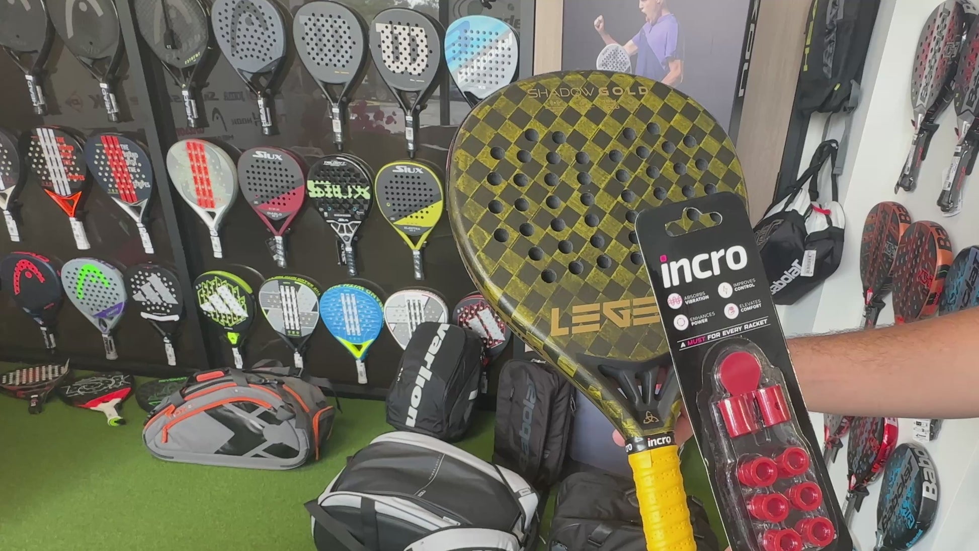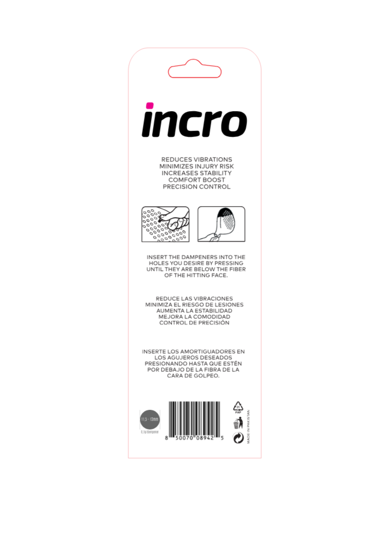 Enhance your padel experience with the INCRO Dampeners, designed to provide exceptional vibration reduction, improved control, and added comfort. Perfect for players seeking relief from tennis elbow, these dampeners minimize racket shock, reducing strain on your arm and wrist during every match.