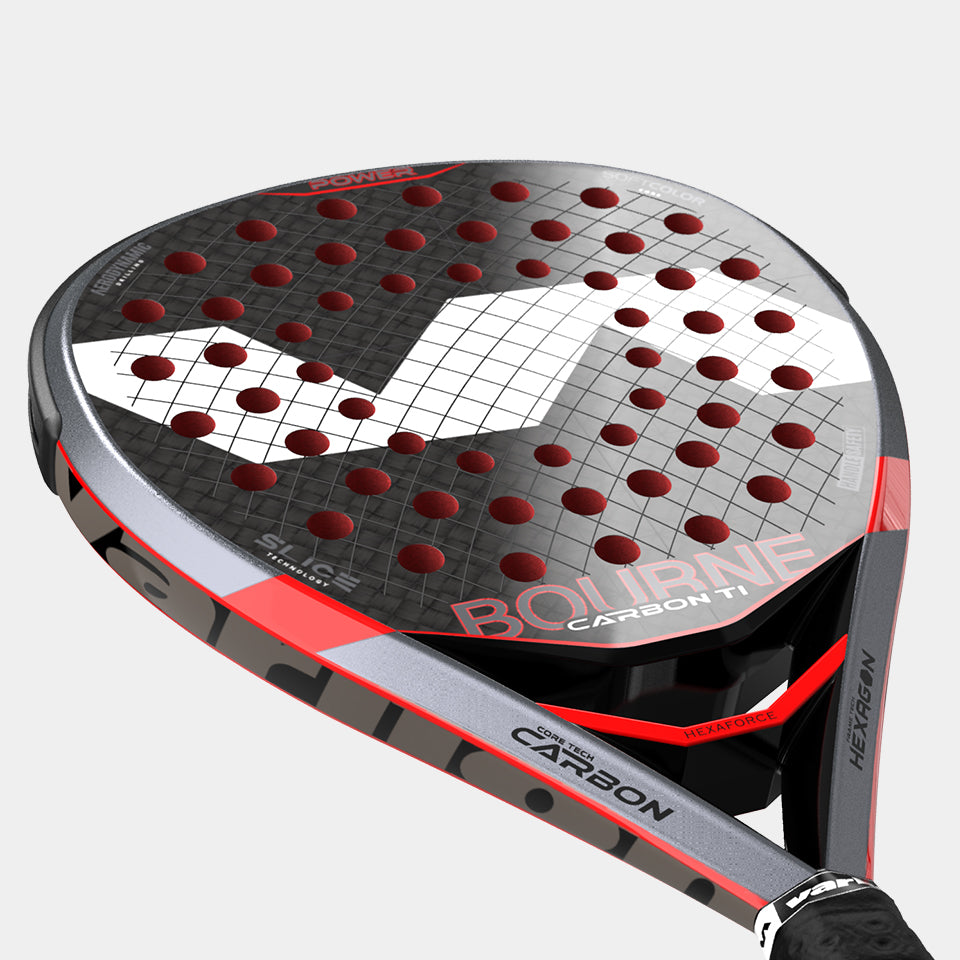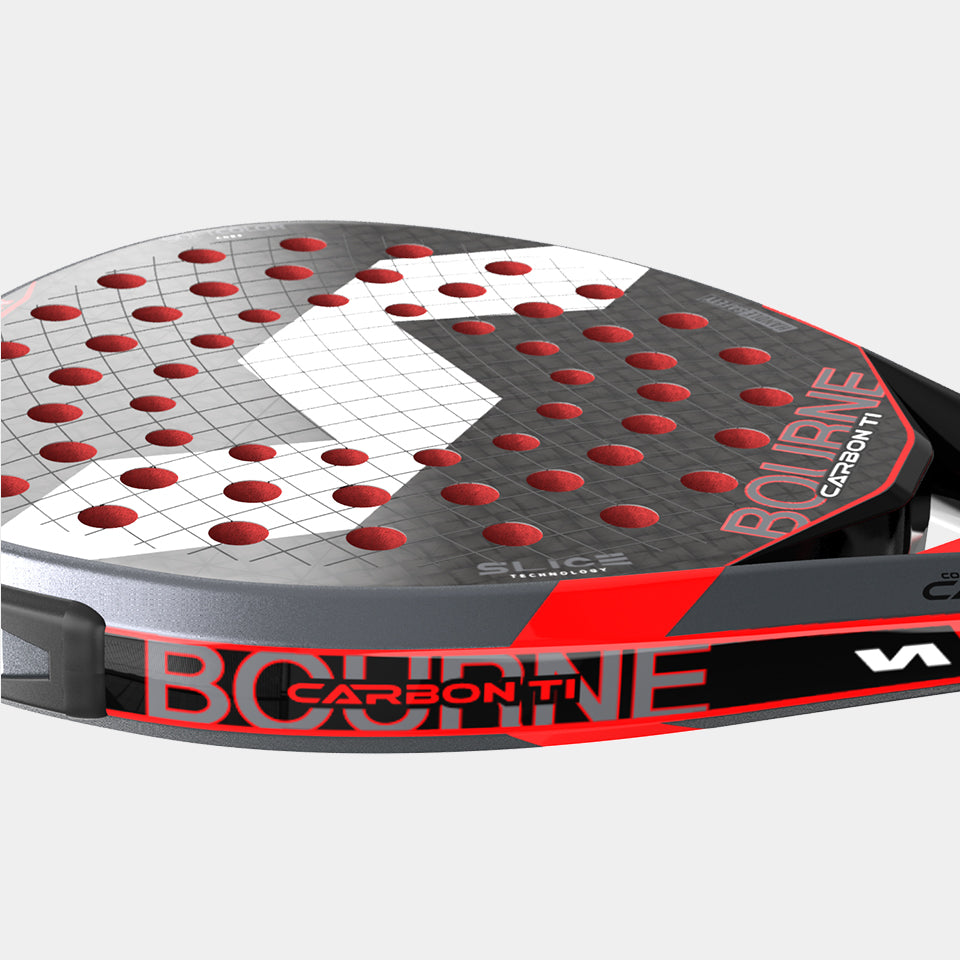La Bourne Carbon Ti features the Aerodynamic Drilling system, which reduces turbulence by avoiding drilling in the center of the racket. This innovation enhances core resistance and hit homogeneity, increasing the racket's sweet spot.