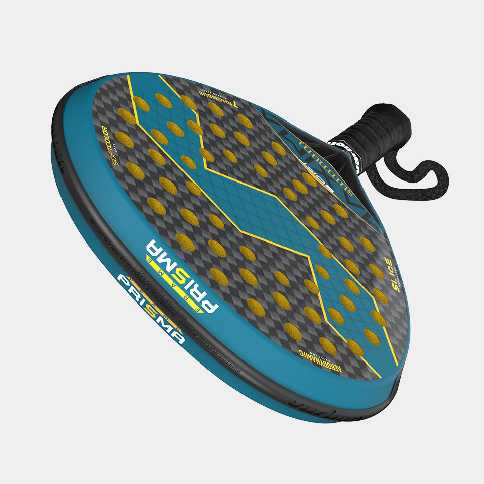 The Prisma frame was created to prevent damage to the racket when hitting the wall or glass. Its prism shape reduces contact area by up to 90% and improves air resistance by 10%, enhancing maneuverability and acceleration.